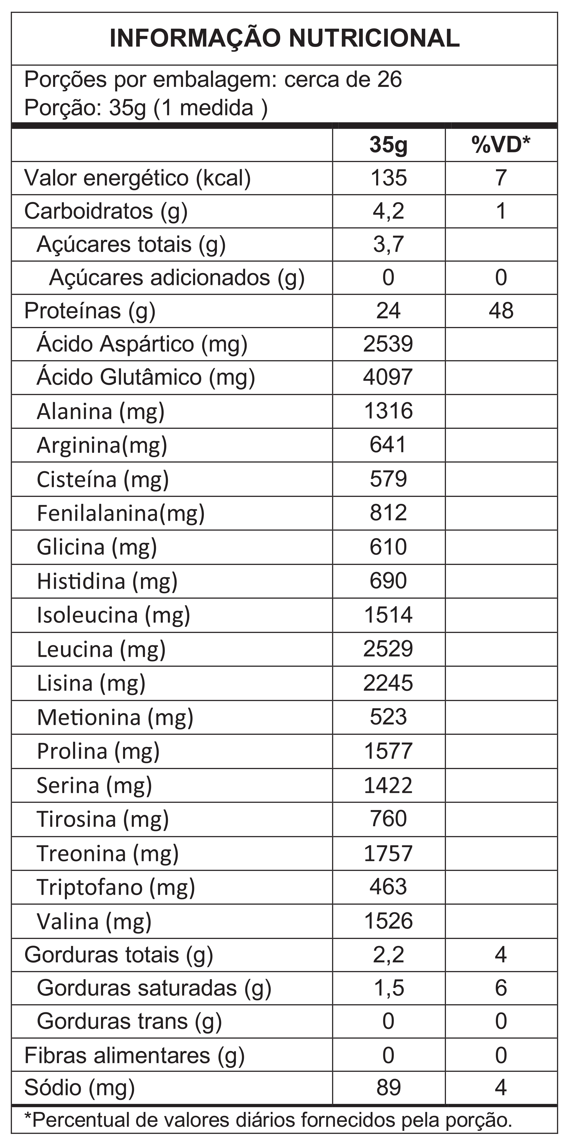 Leite: Proteína Concentrada do Soro do Leite (WPC), Proteína Isolada do Soro do Leite (WPI), Proteína Hidrolisada do Soro do Leite (WPH), Aroma Idêntico ao Natural de Leite, Espessante Goma Xantana e Edulcorante Sucralose.