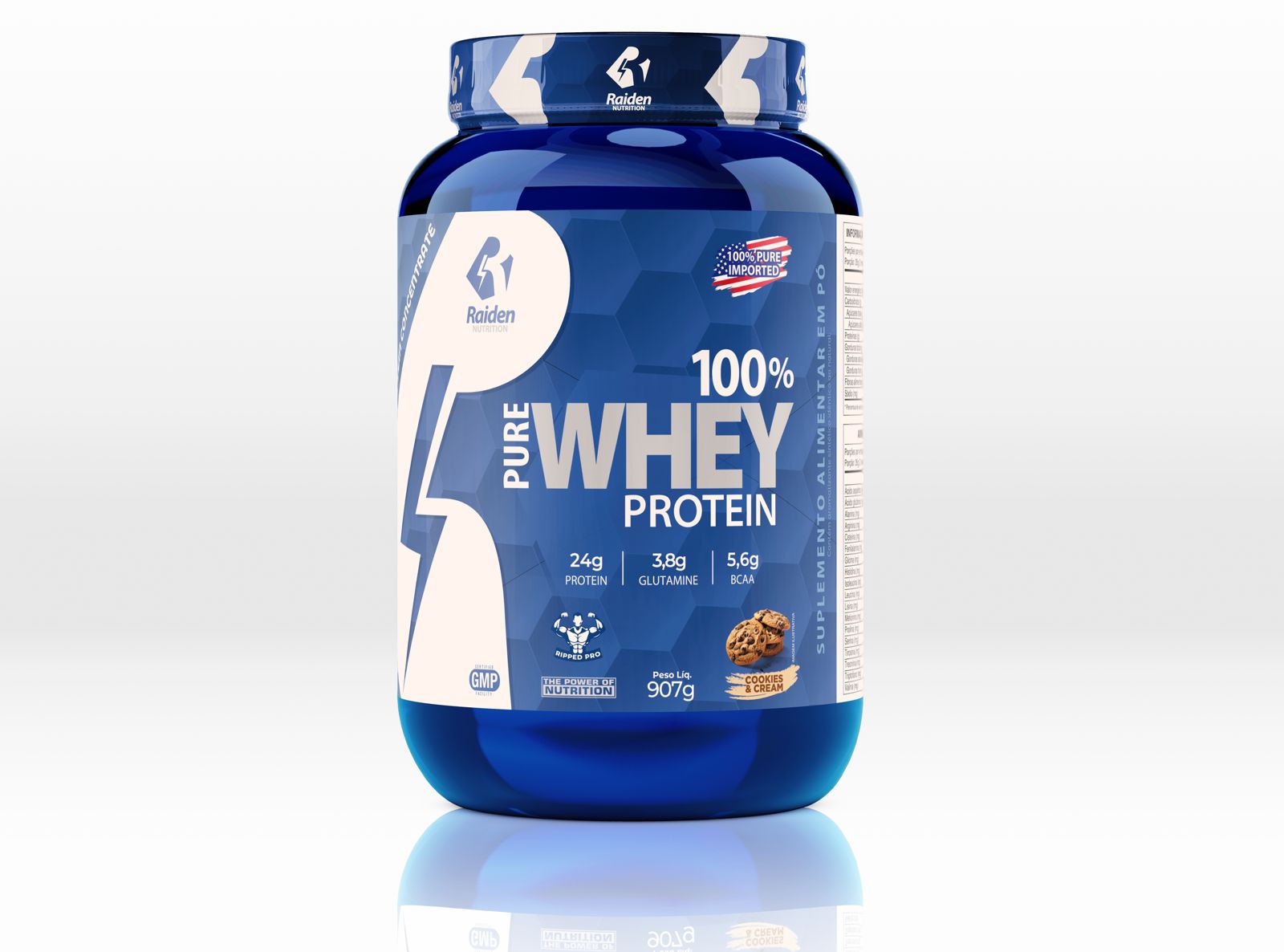 100% Pure Whey Raiden Nutrition é composto pela proteína concentrada extraída do soro do leite por processo de filtração, e com a matéria prima 100% importada e de alto valor biológico, onde se encontra 24g de proteína, 5,6g de bcaa e 3,8g de glutamina por dose.