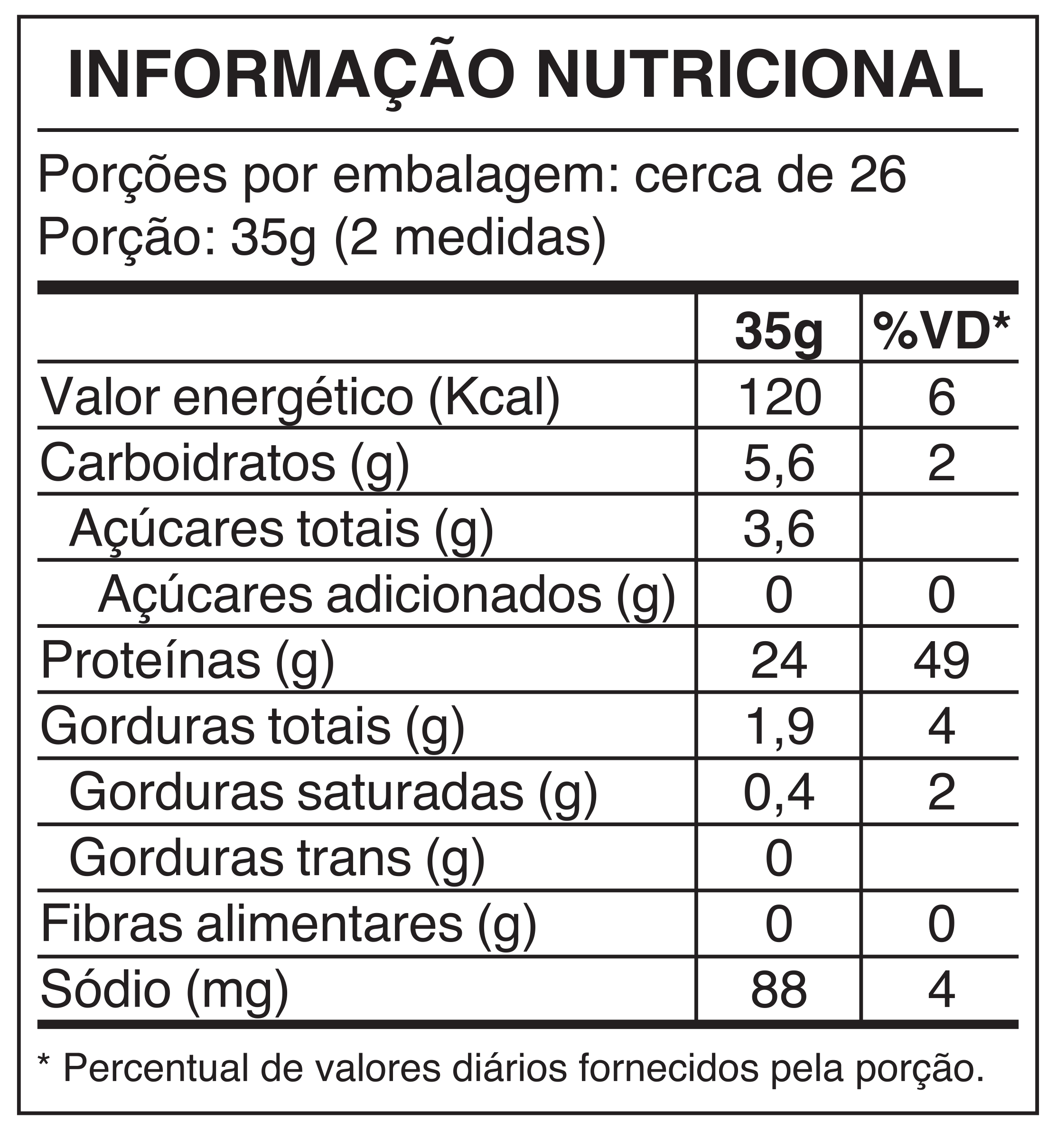 Baunilha: Proteína Concentrada do Soro do Leite (WPC), Aroma Idêntico ao Natural de Baunilha, Emulsificante Goma Xantana e Edulcorante Sucralose.